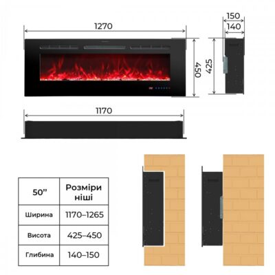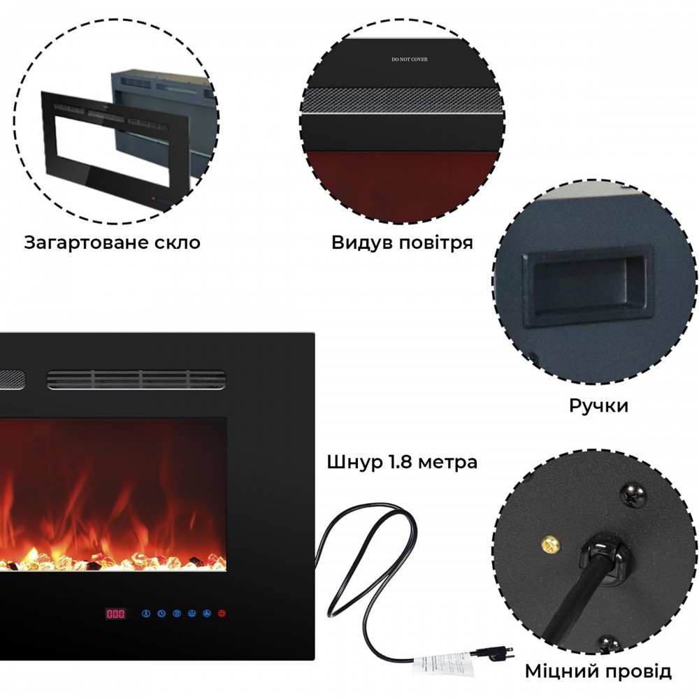 | Додаткові характеристики | 13 варіантів підсвічування наповнення, 13 кольорів полум'я, 2 режими обігріву, 3 рівня гучності звуку (з пульта), Ефект полум'я працює незалежно від обігріву|, Інформаційний екран, Компактні габарити, Комплектація: камін, планка для наповнення, керамічні дрова, кристали 2-х кольорів, пульт дистанційного керування, інструкція, настінні кріплення, Контроль температури: 17-30°С (крок 1°С), 37°С, Обігрів до 25 кв.м, Реалістичність ефекту горіння, Регулювання підсвічування, Сенсорна панель керування, Таймер: від 1 до 9 годин (крок 1год) |