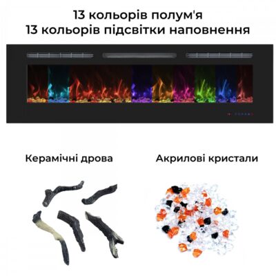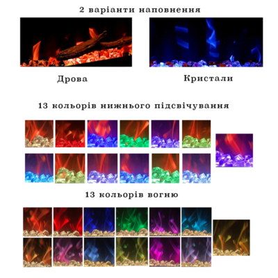 | Наповнення каміна | Акрилові кристали (прозорі та кольорові), Дрова |