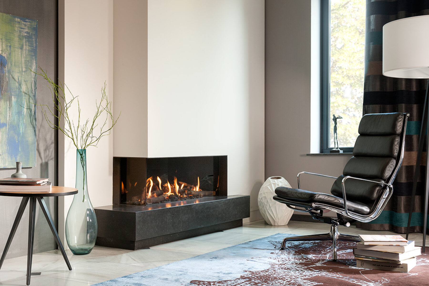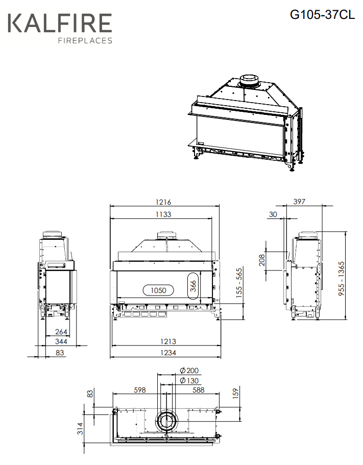 Kalfire Kalfire G105 / 37C L / R – це камін з кутовим склом, ширина фронтального 105 см, ширина бічного 26,8 см, а висота 36,6 см. Є можливість замовити як правобічний камін, так і лівобічний.
