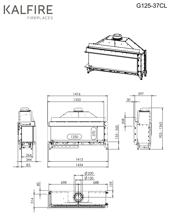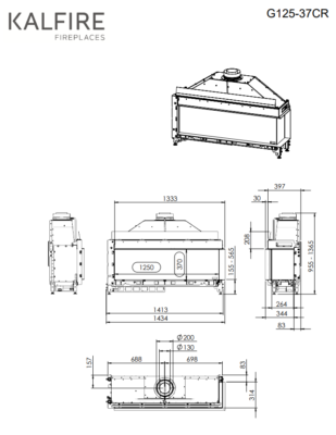 Kalfire G125 / 37C – це великий камін з кутовим склом, ширина фронтального 125 см, ширина бічного 26,8 см, а висота 37 см. Є можливість замовити як правобічний камін, так і лівобічний.