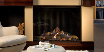 Пальники вбудовані по всій довжині каміна в керамічні поліна, які встановлені в топці у вигляді куреня. Зовні це виглядає немов вогонь виходить безпосередньо з полін. Для ще більш реалістичного полум’я ви можете включити світлодіодне підсвічування в підставі каміна, яка імітує тління дров. Завдяки цій функції камін можна використовувати і в теплу пору року, коли не потрібно обігрів приміщення.
