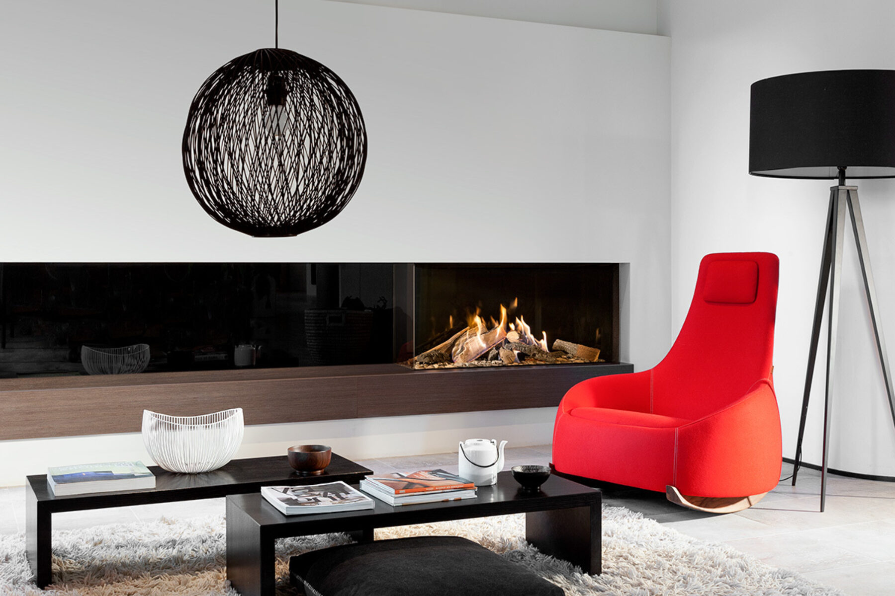 Пальники вбудовані по всій довжині каміна в керамічні поліна, які встановлені в топці у вигляді куреня. Зовні це виглядає немов вогонь виходить безпосередньо з полін. Для ще більш реалістичного полум’я ви можете включити світлодіодне підсвічування в підставі каміна, яка імітує тління дров. Завдяки цій функції камін можна використовувати і в теплу пору року, коли не потрібно обігрів приміщення.