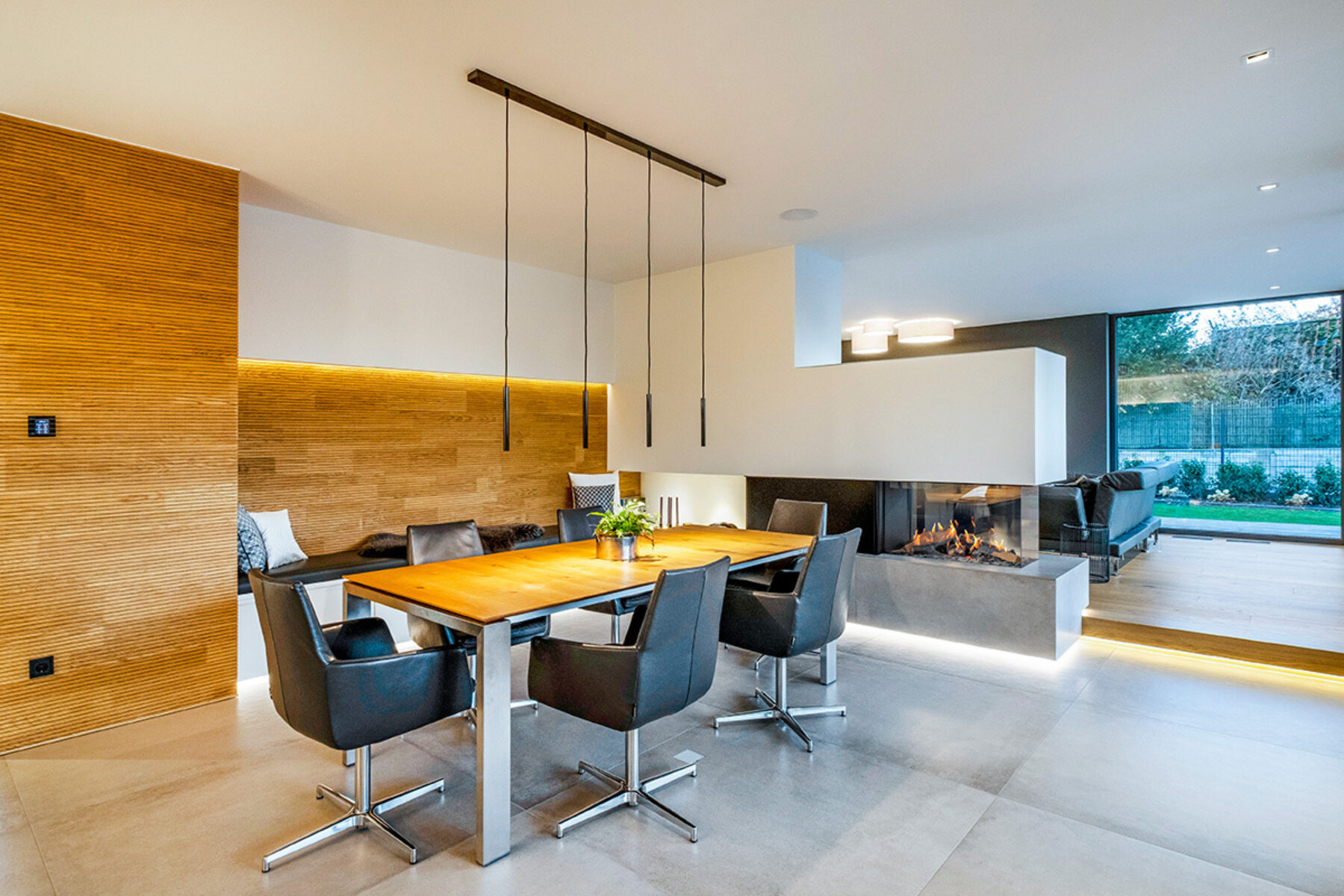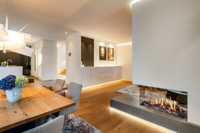 Пальники вбудовані по всій довжині каміна в керамічні поліна, які встановлені в топці у вигляді куреня. Зовні це виглядає немов вогонь виходить безпосередньо з полін. Для ще більш реалістичного полум’я ви можете включити світлодіодне підсвічування в підставі каміна, яка імітує тління дров. Завдяки цій функції камін можна використовувати і в теплу пору року, коли не потрібно обігрів приміщення.