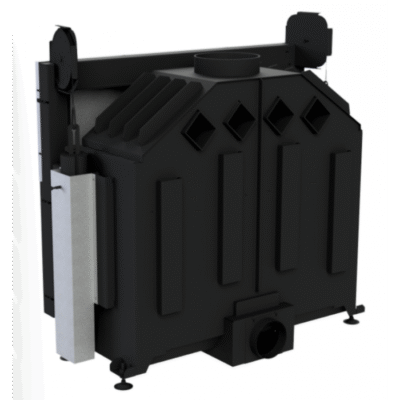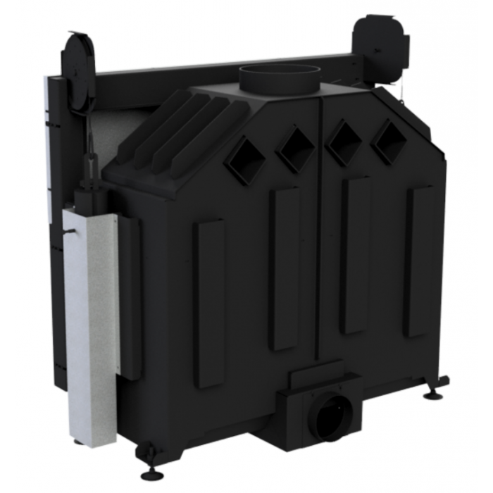 Винесені назовні повітропроводи: Повітропроводи винесені за межі основної конструкції, що дозволяє мінімізувати опір потоків повітря в камеру. Цей підхід забезпечує ефективну циркуляцію повітря навіть у випадках, коли димохід не прогрітий, що підвищує ефективність згоряння палива і стабільність температури.