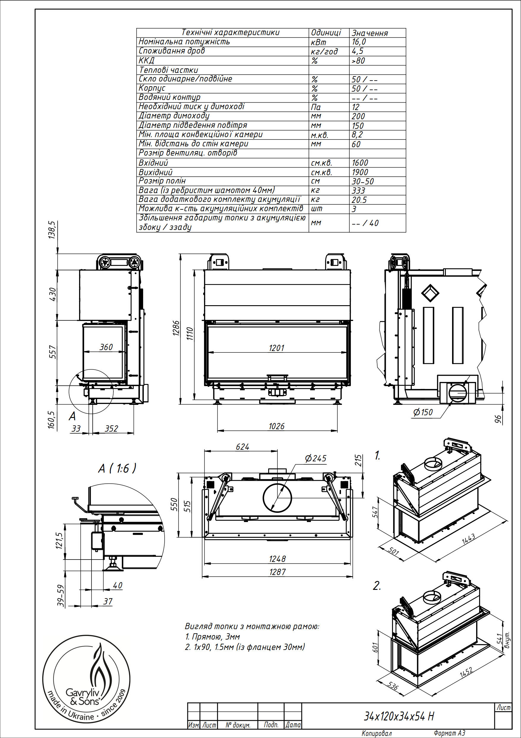 Камінна топка Gavryliv&Sons 34х120х34х54 – це тристоронній камін, відкривається підняттям вгору.