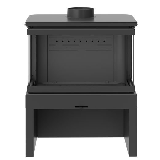 Чавунна піч KFD STO M 14 3F – на підставці дровниці, тристоронні скляні дверцята відкриваються в сторону.