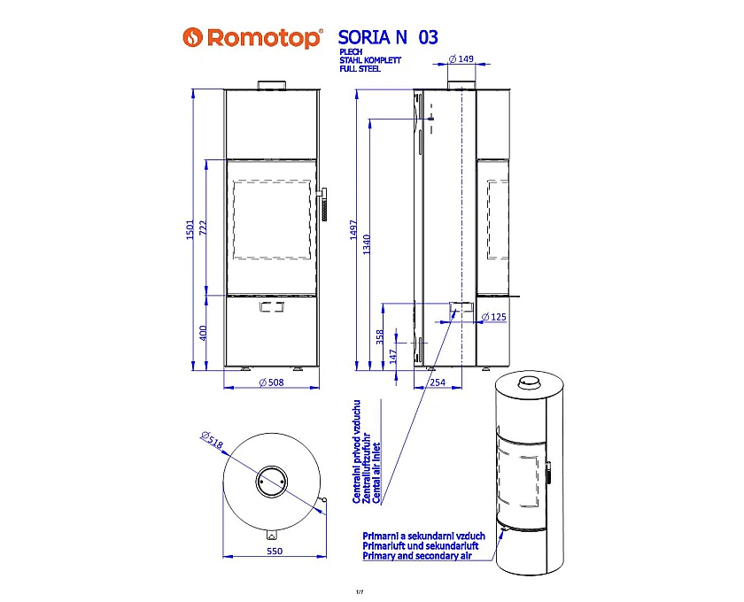 Печі-каміни SORIA N оснащені новою системою закривання дверцят, яка забезпечує зручне самозакривання дверей. Процес горіння в новій камері оптимізовано для досягнення найкращої ефективності. Велике скління дверей містить дизайнерський принт. Піч може бути оснащена спеціальними акумулюючими плитками в просторі над камерою згоряння. Ця «маса» акумулюючих елементів може продовжити термін випромінювання тепла печі до 5,5 годин. Камера згоряння оснащена великою чавунною колосниковою решіткою і жаростійкою плиткою з шамотної цегли. Ця камінна піч підходить для будинків з низьким енергоспоживанням. Стандартна версія включає можливість підключення верхнього або заднього відводу димових газів. Система EAI (зовнішнього повітрозабірника) включена. Завдяки вторинному повітрозабірнику скло дверей промивається повітрям, щоб запобігти накопиченню кіптяви. Первинний і вторинний повітрозабірники регулюються одним керуючим елементом.